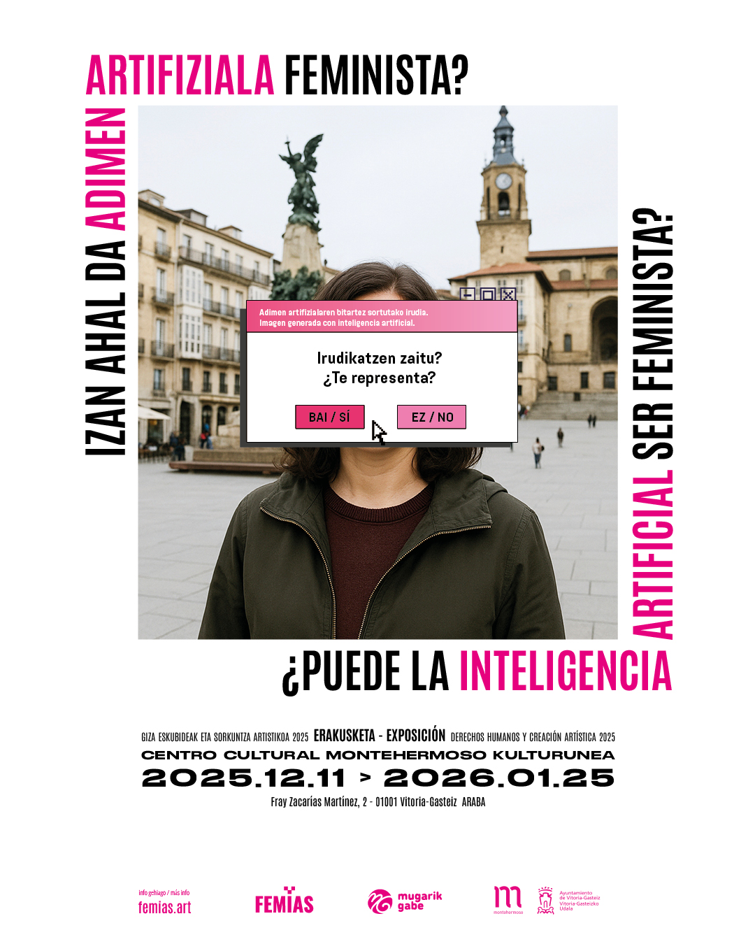 La Colectiva Femias, con la colaboración de Mugarik Gabe ha desarrollado una exposición artística que nos invita a reflexionar sobre la Inteligencia Artificial y su influencia en la construcción de imaginarios.
