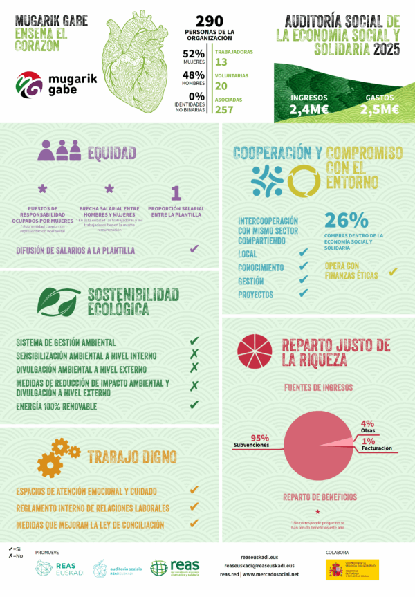 Un años, más en 2025 nos hemos sometido a la Auditoría Social impulsada por REAS EUSKADI y Mugarik Gabe ha obtenido el sello que nos acredita como parte de la ECONOMÍA SOCIAL Y SOLIDARIA